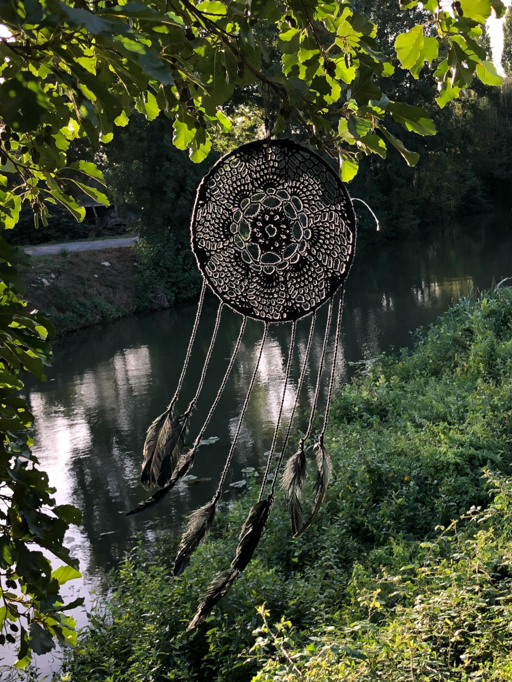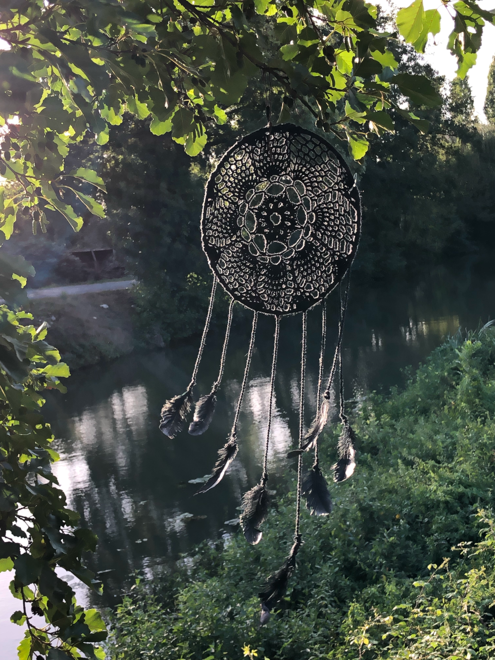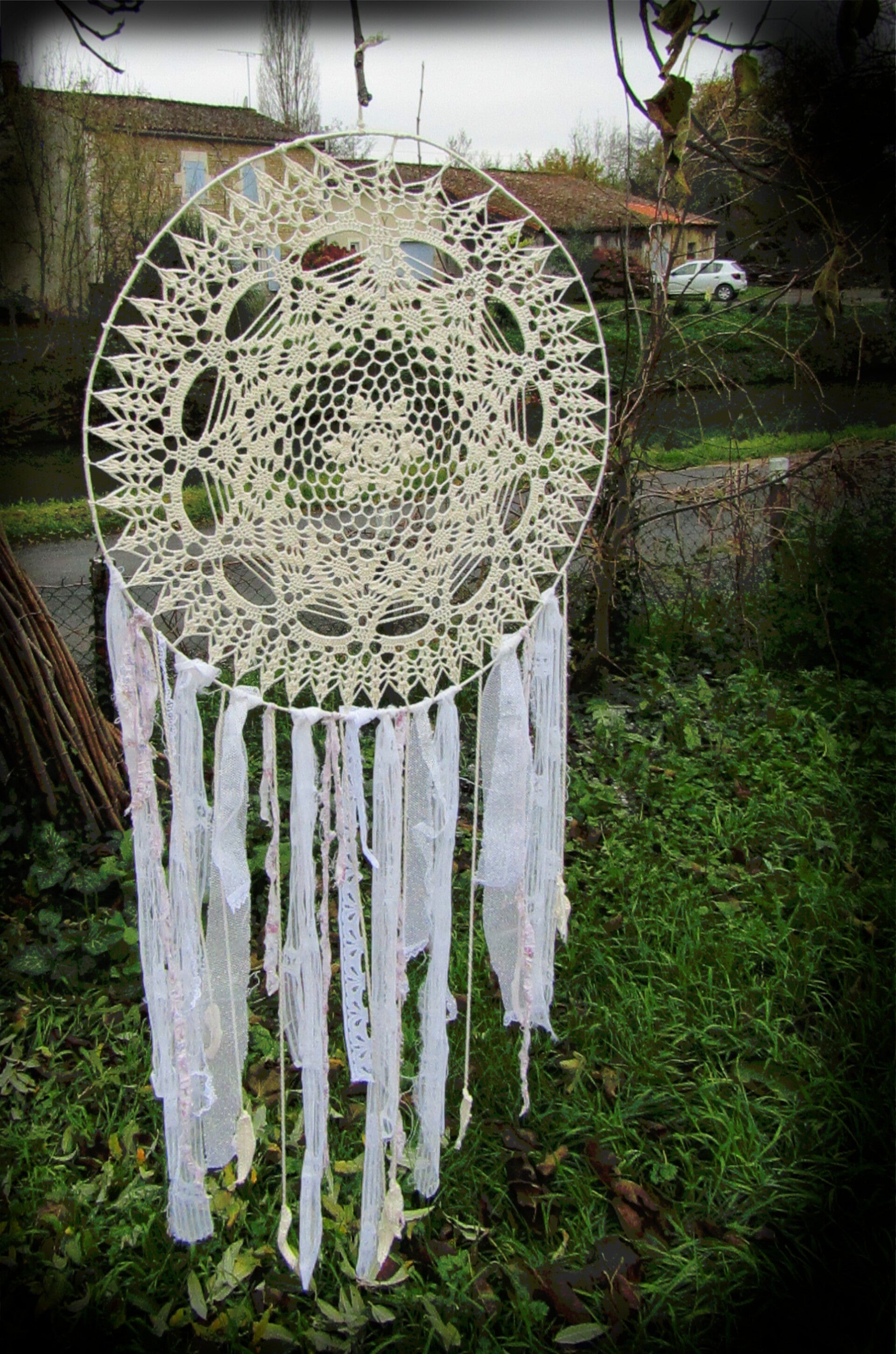 Le cercle est en bois du jardin et les fils en coton- Il est empli des lumières de l'été