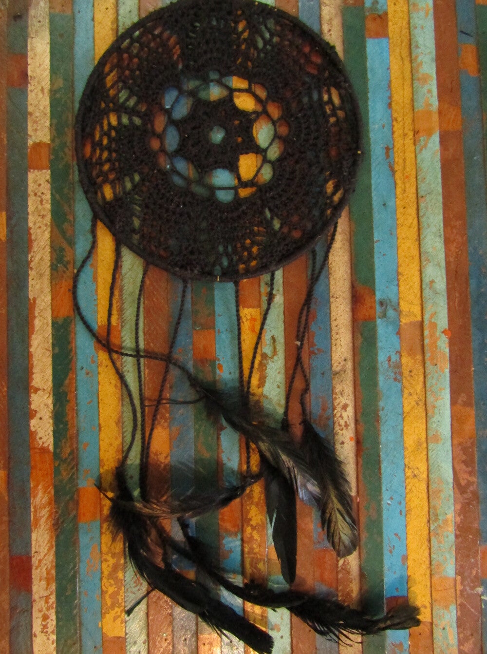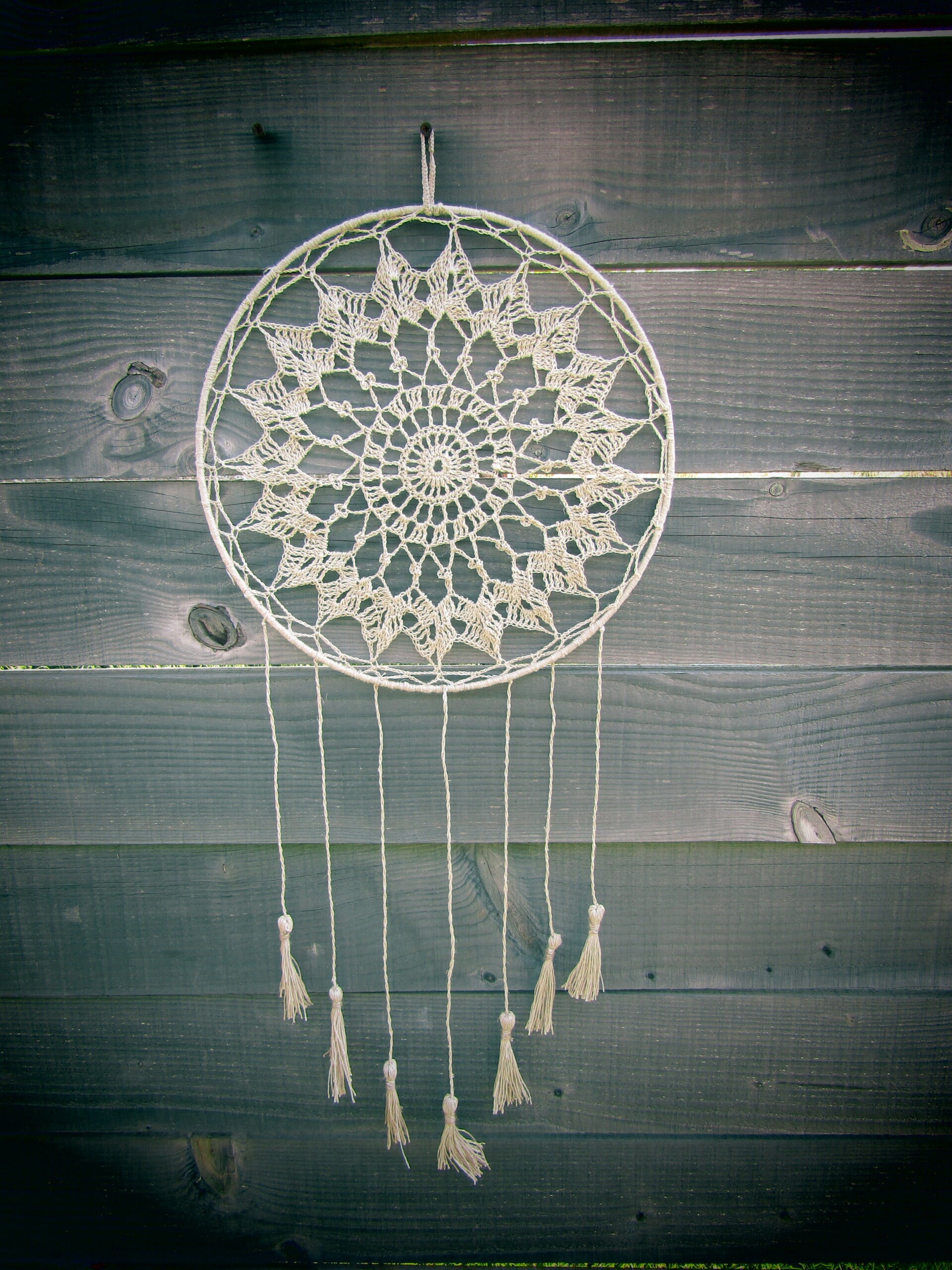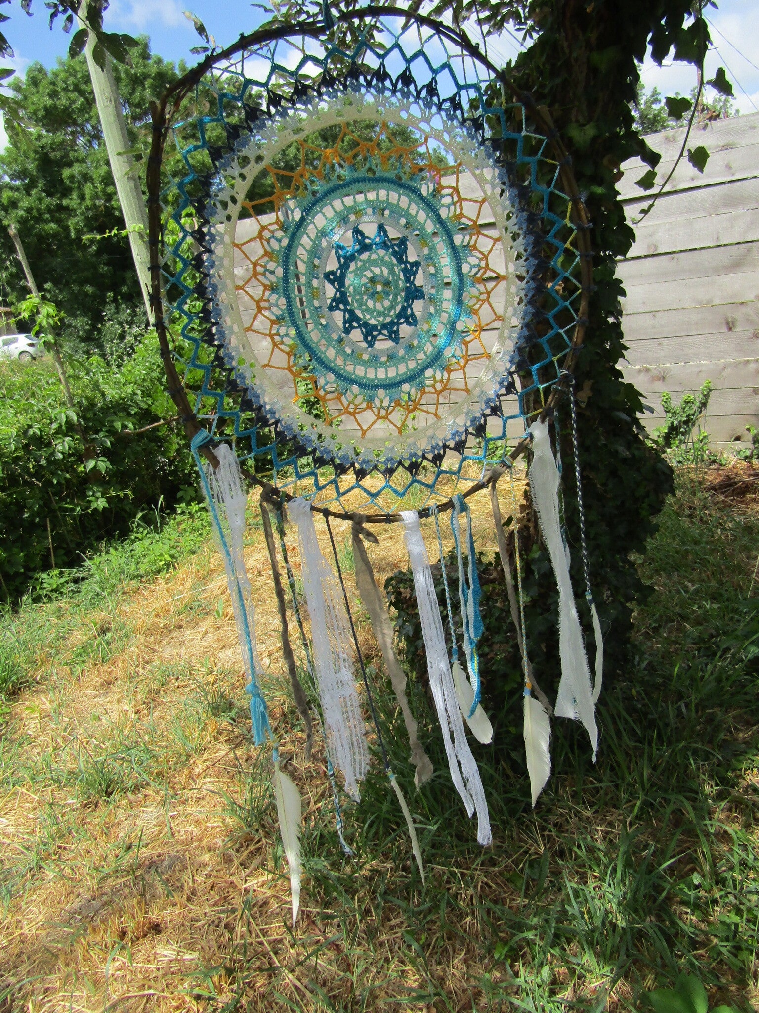 Le cercle est en bois du jardin et les fils en coton- Il est empli des lumières de l'été